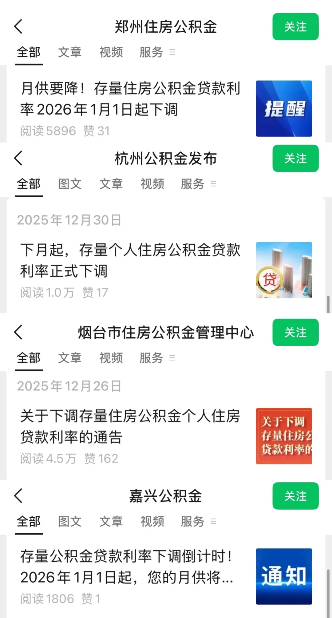 2025年12月26日以来,郑州、嘉兴、烟台、兰州、酒泉等多地公积金管理中心发布的相关通知,明确符合条件的贷款人公积金贷款利率将自动调整。