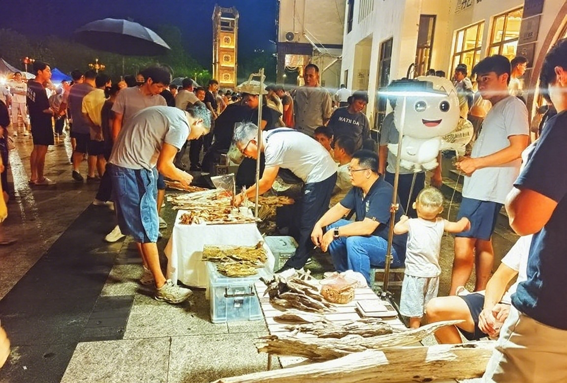 当晚夜幕降临,沉香夜市街迎来如潮人流。现场摩肩接踵、熙熙攘攘,来自镇隆镇的20多家沉香商家、非遗传承人齐聚一堂,展销沉香原料、工艺品、香道用品等百余种特色产品。市民和游客不仅能近距离感受沉香的独特魅力,还能亲身体验传统沉香知识科普,领略“沉香文化”的千年传承。为拓宽沉香产业销售渠道,活动还通过直播平台向线上观众推介镇隆沉香,从沉香线香的制作工艺到养生功效。华南师范大学岭南青年实践队唐尚珺等队员也加入主播队伍,带领线上观众“云逛夜市”,感受“指尖上的非遗”。