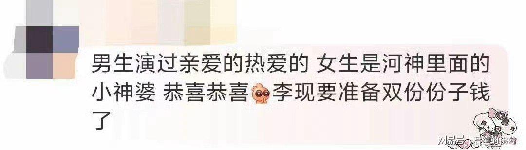 网友开玩笑李现的钱包要“遭殃”了,他要出双份份子钱,男方合作了《亲爱的热爱的》,女方合作了《河神》。
